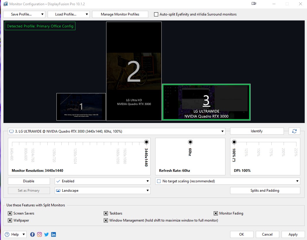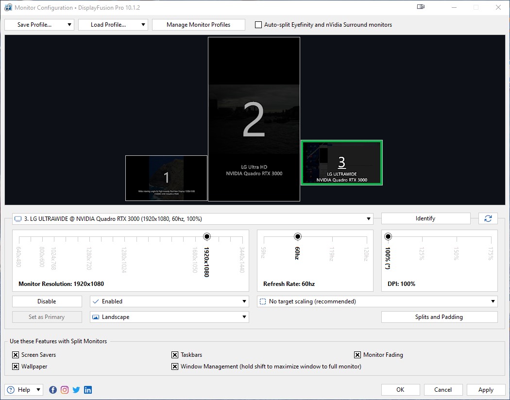 I have 2 external monitors connected to a laptop workstation running Win 10 via a USB-C docking station with 1 DisplayPort and multiple HDMI outputs. If I boot the system with the docking station connected, DF NEVER detects the correct monitor configuration. The main problem is the horizontal LG UltraWide monitor, which DF detects at a resolution of 1920x1080, 60Hz, when the profile has it stored as 3440x1440, 60Hz. Once I manually load the profile, then DF detects properly, as shown in the 2nd attachment.
