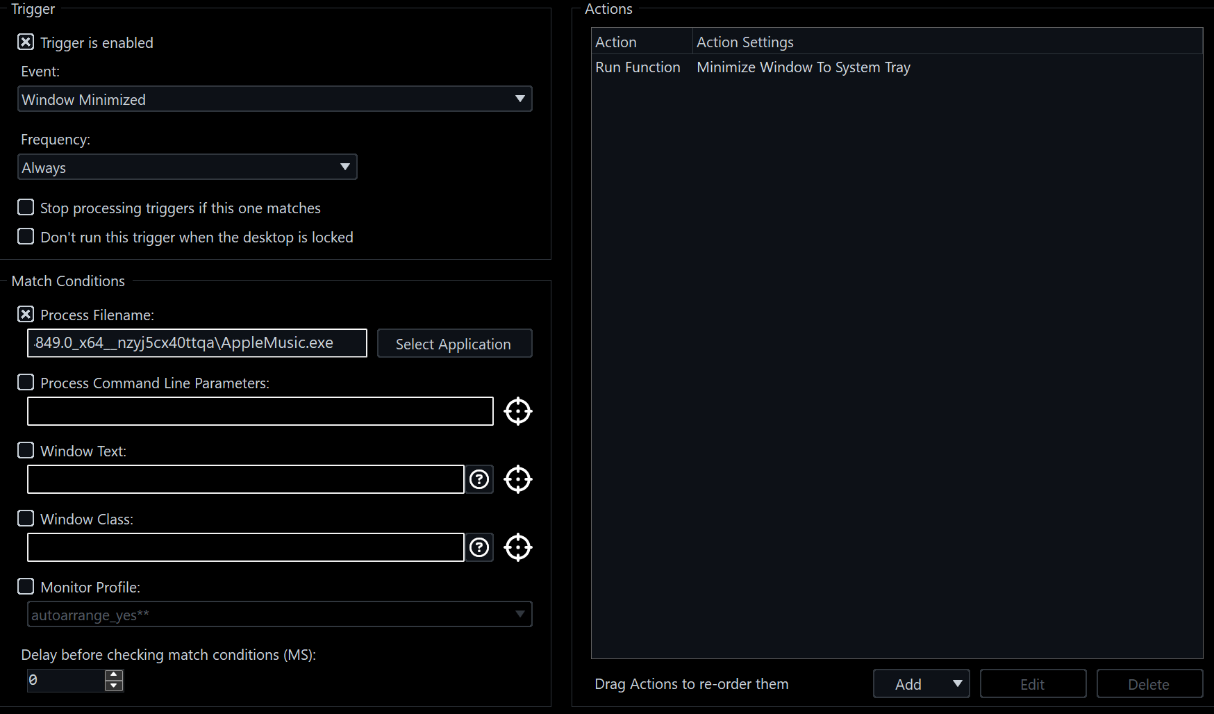 I just downloaded the new Apple Music app after using iTunes forever. One thing that bugs me that I'd like displayfusion to help with is when you switch to the mini player, it minimises the main window. I tried adding a trigger to send Apple Music to the system tray when the main window is minimised. It works if I manually minimise the window but not when it just switches to the mini player. I can only assume that when it switches that it doesn't actually minimise the window? Any thoughts on how to get this to work?