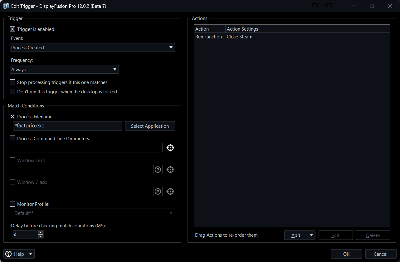 For your second request this can also be done with a scripted function to end the Steam process and a Process Ended Trigger. You'll need to set up a new Process/Window created trigger for each of the games you would like steam to exit with. Below is a screenshot of a trigger I've set up for Factorio: