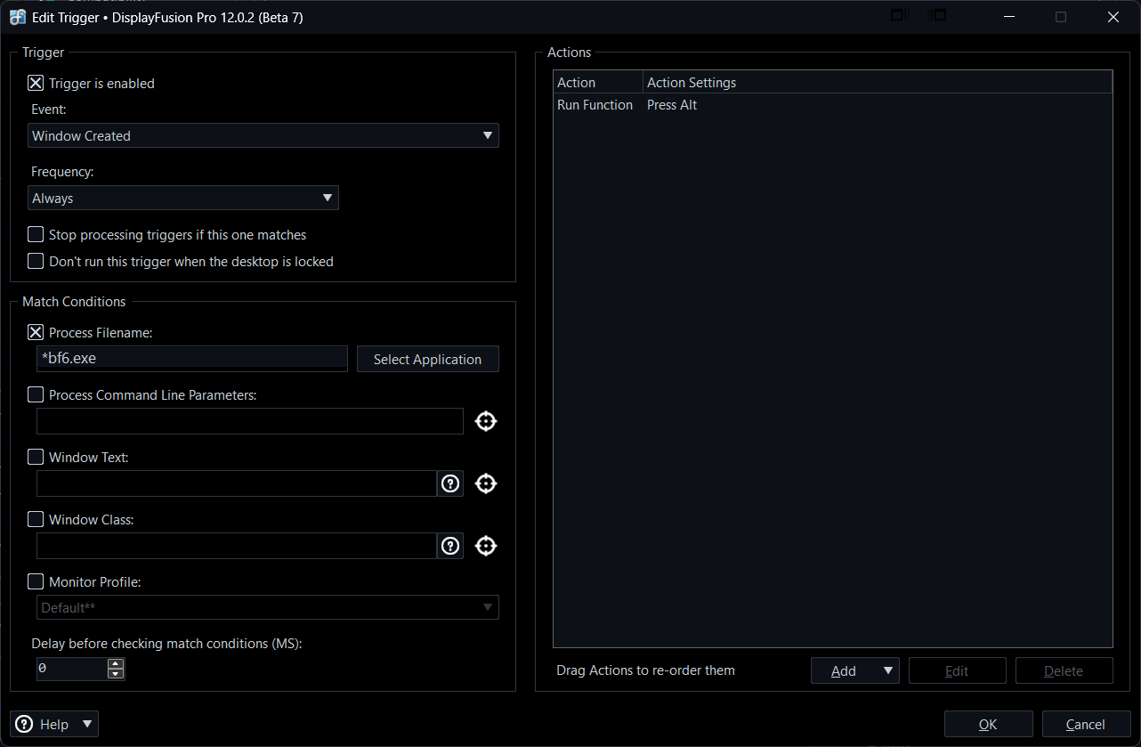 For your first request this can be acomplished with two scripted functions and Window Created/Process Created and Process Ended triggers. The first scripted function presses the ALT button, the other releases it. The triggers will control when these functions get used. Below is a screenshot of these triggers set up for Battlefield 6: