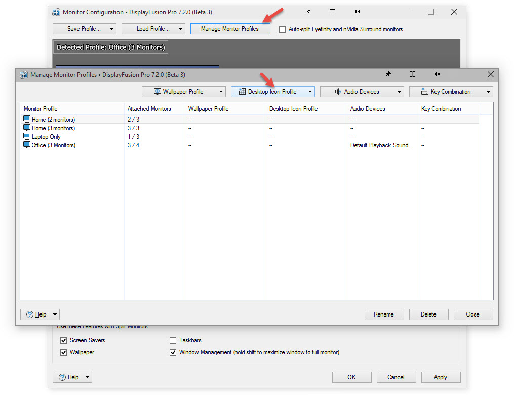 My setup is: A Notebook and two additional monitors, all three at the same resolution (full-hd). Most of the times, I use it like this, only sometimes I unplug the notebook and use it without the additional displays. The two additional monitors are attached via an "i-tec usb 3.0 docking station" which has its own graphics adapter, so the problem might be due to this maybe? Because, the thing is: Whenever Display Fusion starts, I have to manually select the correct Icons Profile (via: right-click on tray symbol > "desktop icons (profiles)" > load profile; I run Display Fusion in German, so the actual menu items might be named a little bit different than stated here, sorry for that). This is necessary both when I have my Notebook unplugged or when I have the additional two displays attached -- in neither situation a correct profile is loaded. I'm running Windows 8.1 64 bit,