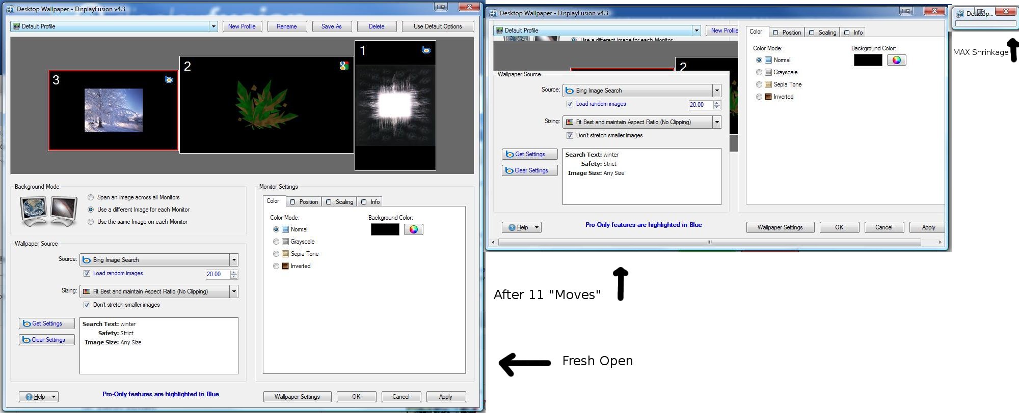 When I open Display Fusion on the landscaped monitors, it opens and runs fine. When I open DFusion on the portrait mode monitor it opens, and every time I move the window (even if its moved to the landscaped monitors) it shrinks upward to nothingness (See Attached). I was thinking it could be because the width of the window is > the width of the screen...idk