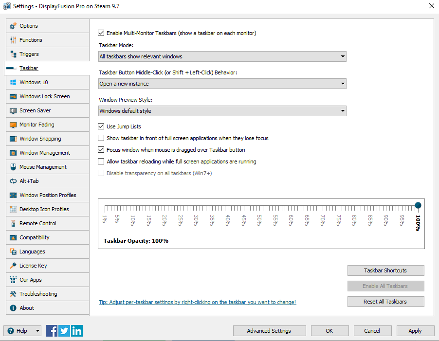 I have a 5120x1440 ultrawide, so I have 3 taskbars displayed on my screen at all times (e.g. the screen is cut vertically into 3 sections)