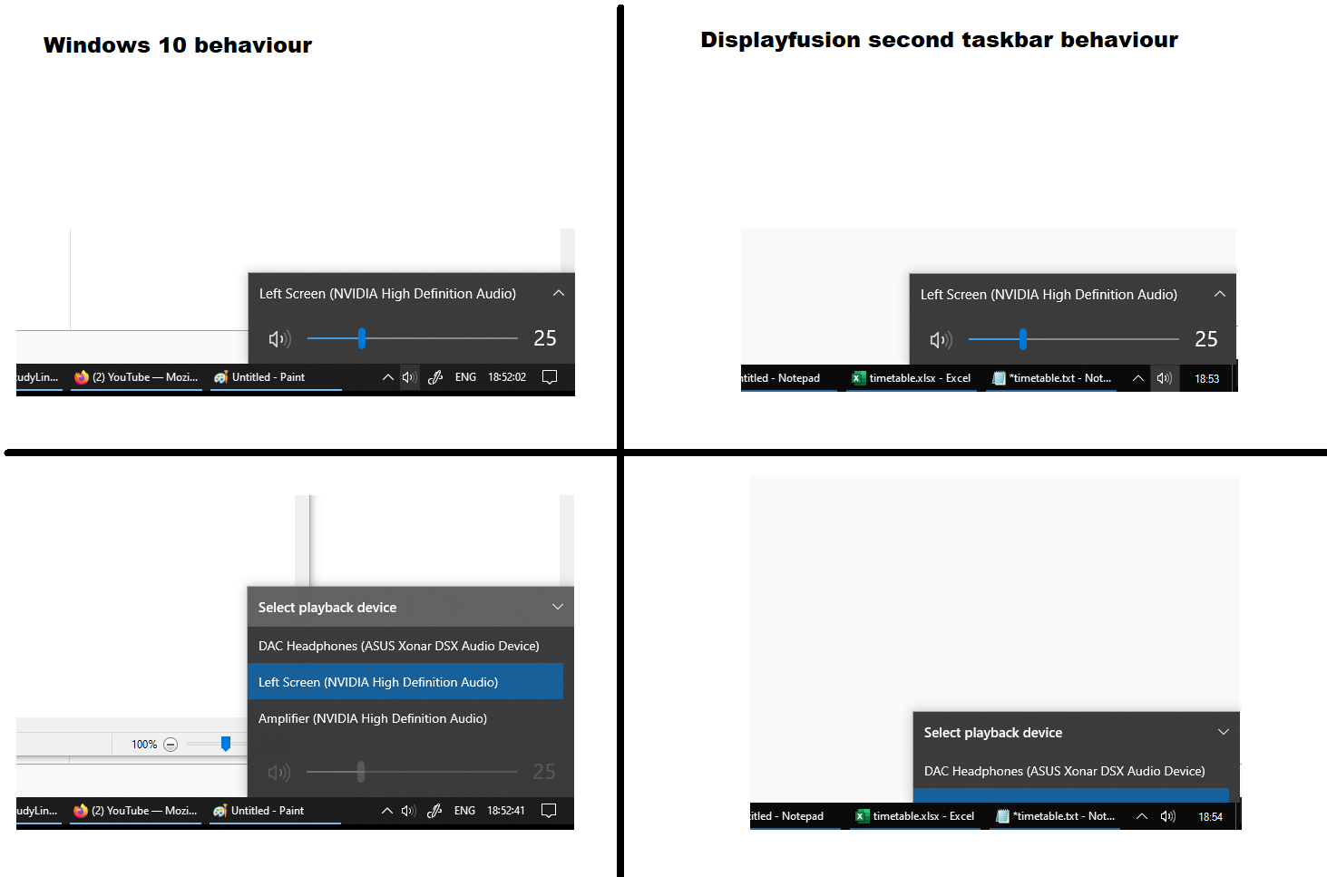 Screenshots attached of the behaviour. I am using Windows 10. Please note that I have a few taskbar tweaks applied to make it feel more like windows 7,but disabling them has no impact on the audio selection bug described above.