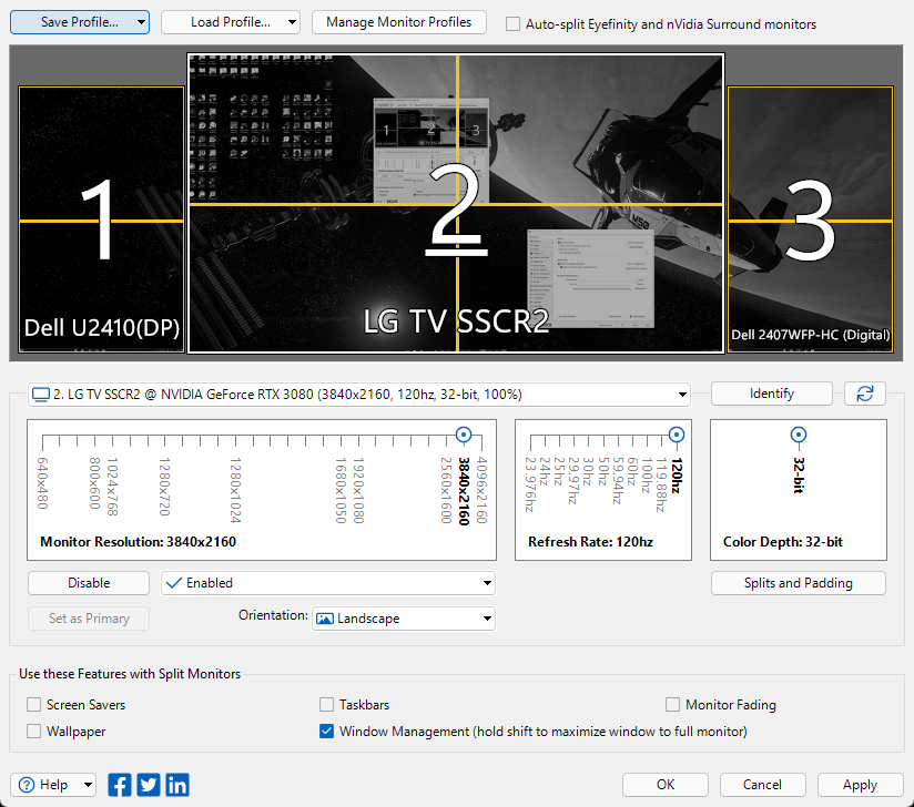 - I'm running a triple monitor setup with each monitor having splits (I've included a screenshot of my monitor configuration window in DisplayFusion):