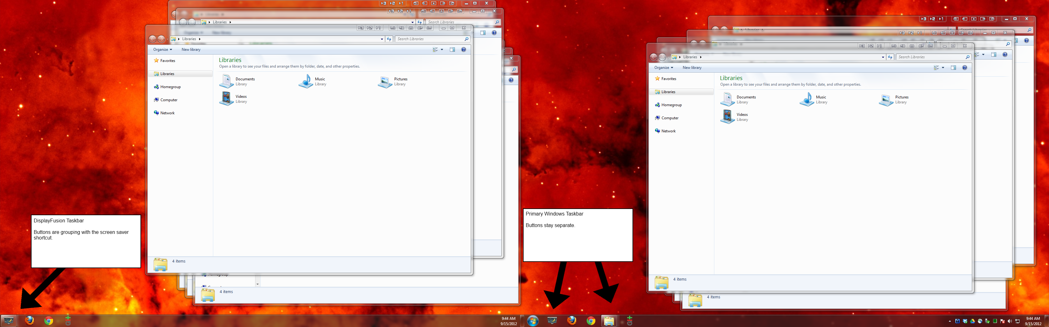 The screenshot shows my primary and second monitors, each with a handful of Explorer windows open. You can see that the buttons all collapse onto the screen saver button on the DisplayFusion taskbar. However, the primary Windows taskbar behaves as expected.