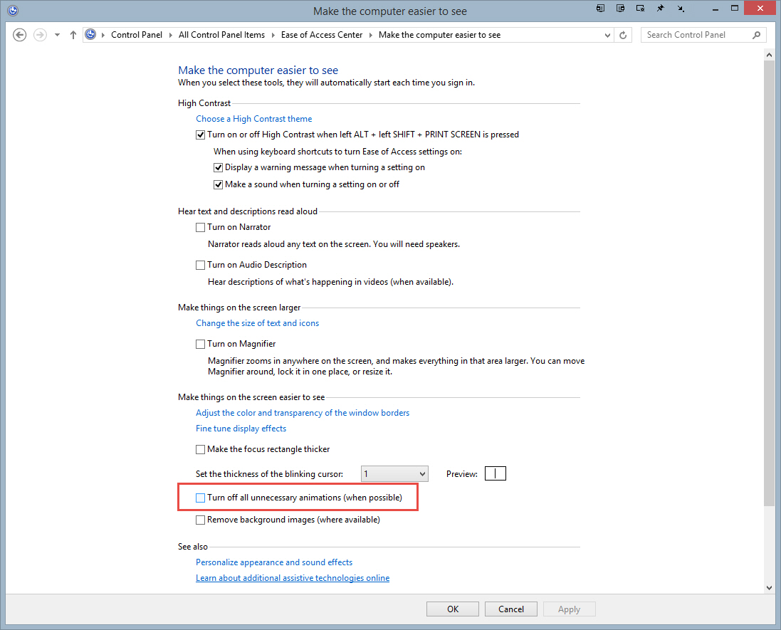 Control Panel > Ease of Access Center > Make the computer easier to see > Turn off unnecessary animations