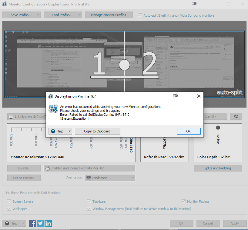 I cannot save monitor splits. I get a SetDisplayConfig error. See attached