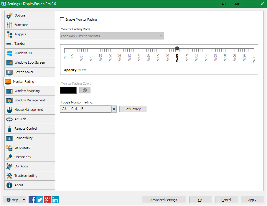 The checkbox on that tab is "Enable Monitor Fading". To me, that means "Enable this new feature, systemwide". But what that checkbox does is "Perform the 'Monitor Fading' feature, right now."