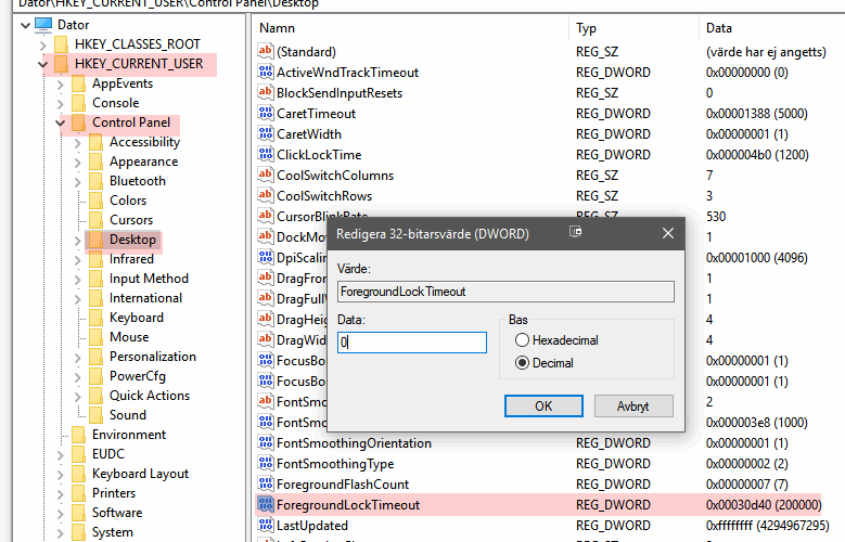 In the right hand pane scroll down to ForegroundLockTimeout and click on it to open the edit box.