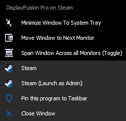When Steam windows are on the main screen (using the Windows taskbar) they have several context menu options, from launching specific windows to recently played games. When I move these windows to a secondary monitor with a DF taskbar, all these options disappear. See the screenshots for illustration.