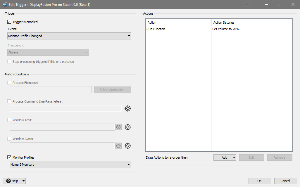 I already use DisplayFusion to put my windows back in their places when I re-dock my computer and was wondering if it could mute or un-mute the computer audio based on the current monitor profile.