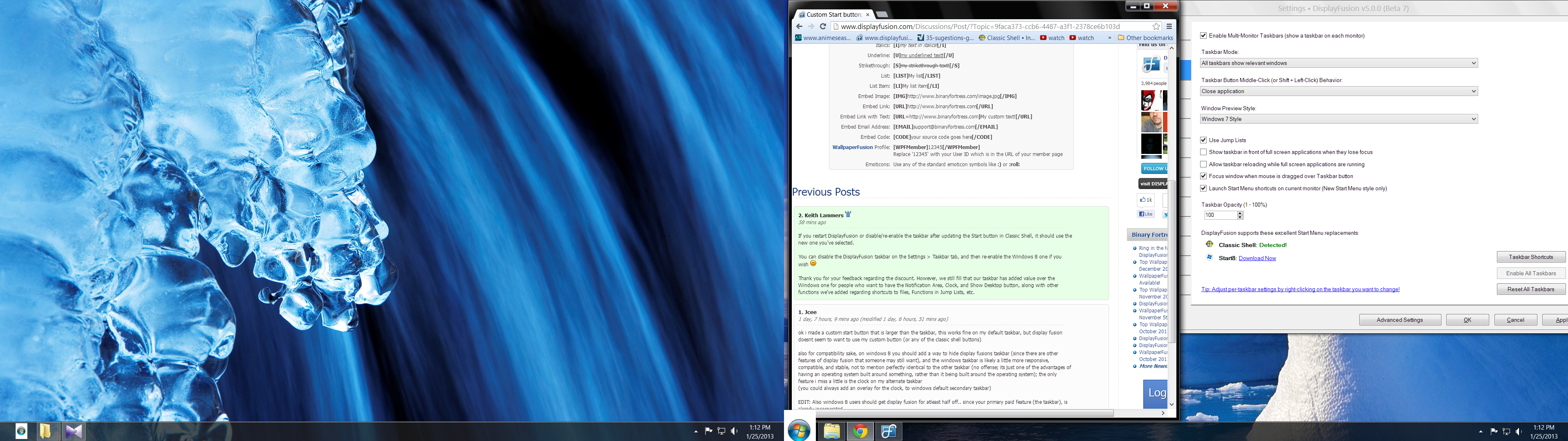 also for compatibility sake, on windows 8 you should add a way to hide display fusions taskbar (since there are other features of display fusion that someone may still want), and the windows taskbar is likely a little more responsive, compatible, and stable, not to mention perfectly identical to the other taskbar (no offense; its just one of the advantages of having an operating system built around something, rather than it being built around the operating system); the only feature i miss a little is the clock on my alternate taskbar