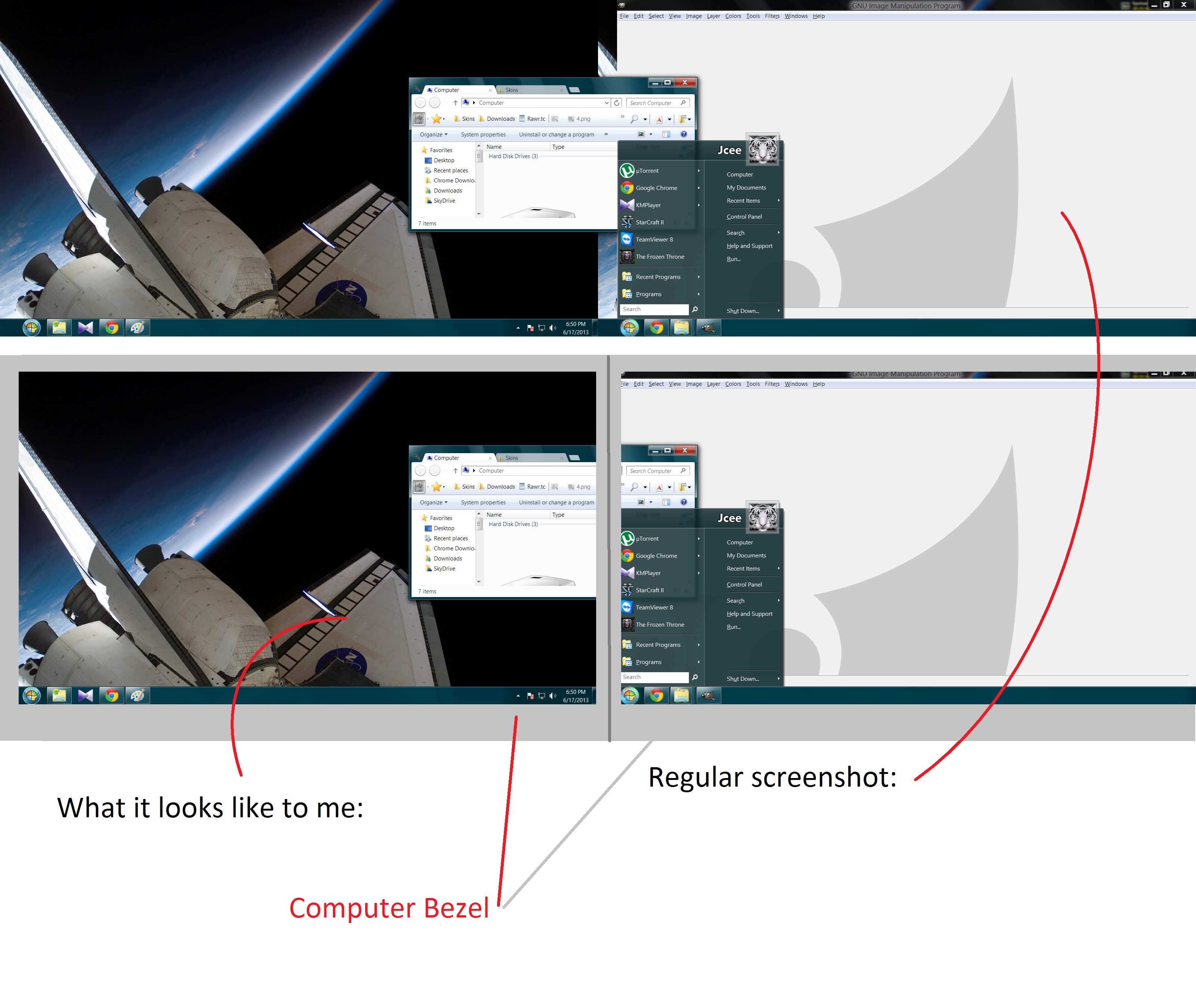 Then you throw those coral boundaries in the cut off parts, and Viola, maximized apps maximize properly, and you can drag apps across to other screens without any visual distortion. The only problems are the start menu, and fullscreen programs tend to ignore this program...