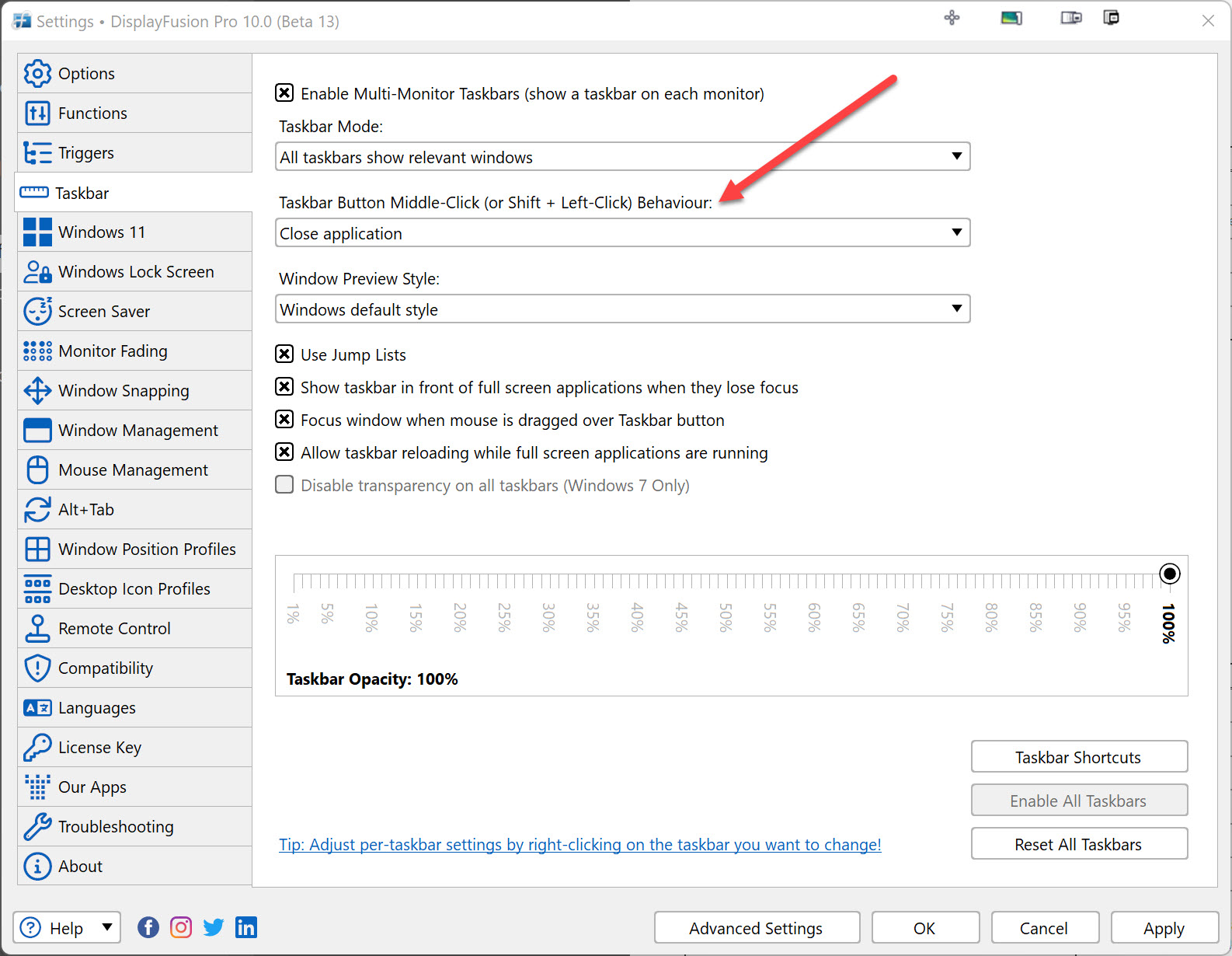 Middle clicking the task bar buttons causes an additional instance to be created. It does not close as settings would indicate.