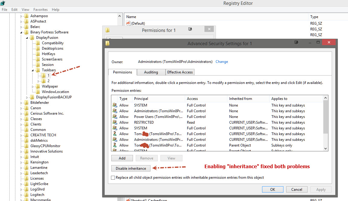 Wow, that's really strange! I just checked the permissions on mine, and inheritance is enabled on all of the keys, so that's definitely weird that yours was disabled.