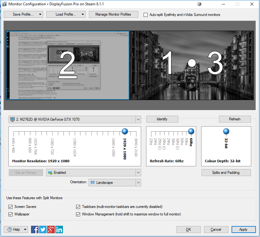 - M2762D @ NVIDIA GeForce GTX 1070 (ID: 2 • Serial: • Primary: False • Attached: True • Extra: False • Split: False • Split Padding: L=0, R=0, T=0, B=0 • Bounds: X=1920, Y=0, W=1920, H=1080 • WorkArea: X=1920, Y=0, W=1920, H=1080 • RefreshRate: 60hz • ColourDepth: 32 • Clone: {X=1920,Y=0,Width=1920,Height=1080} • Driver: Builtin • Device: \\.\DISPLAY2 • TA:ID: 4359 • TA:AID: 32562:0 • Output: HDMI • DPIScaleX: 1 • DPIScaleY: 1 • Orientation: Landscape)