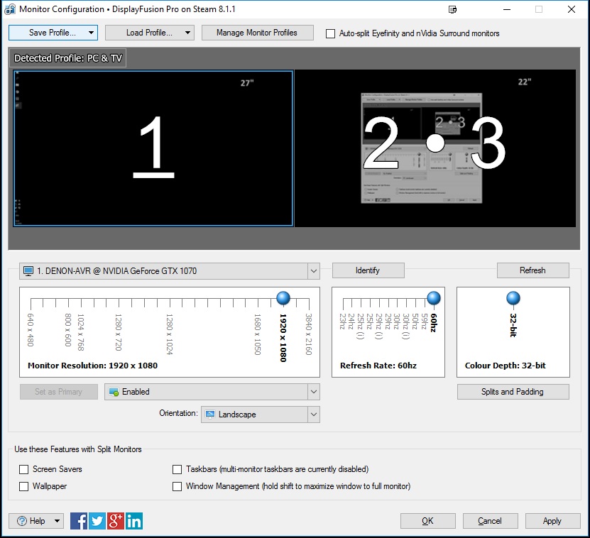 - DENON-AVR @ NVIDIA GeForce GTX 1070 (ID: 3 • Serial: • Primary: False • Attached: True • Extra: False • Split: False • Split Padding: L=0, R=0, T=0, B=0 • Bounds: X=1920, Y=0, W=1920, H=1080 • WorkArea: X=1920, Y=0, W=1920, H=1080 • RefreshRate: 60hz • ColourDepth: 32 • Clone: {X=1920,Y=0,Width=1920,Height=1080} • Driver: Builtin • Device: \\.\DISPLAY2 • TA:ID: 50336001 • TA:AID: 32562:0 • Output: HDMI • DPIScaleX: 1 • DPIScaleY: 1 • Orientation: Landscape)
