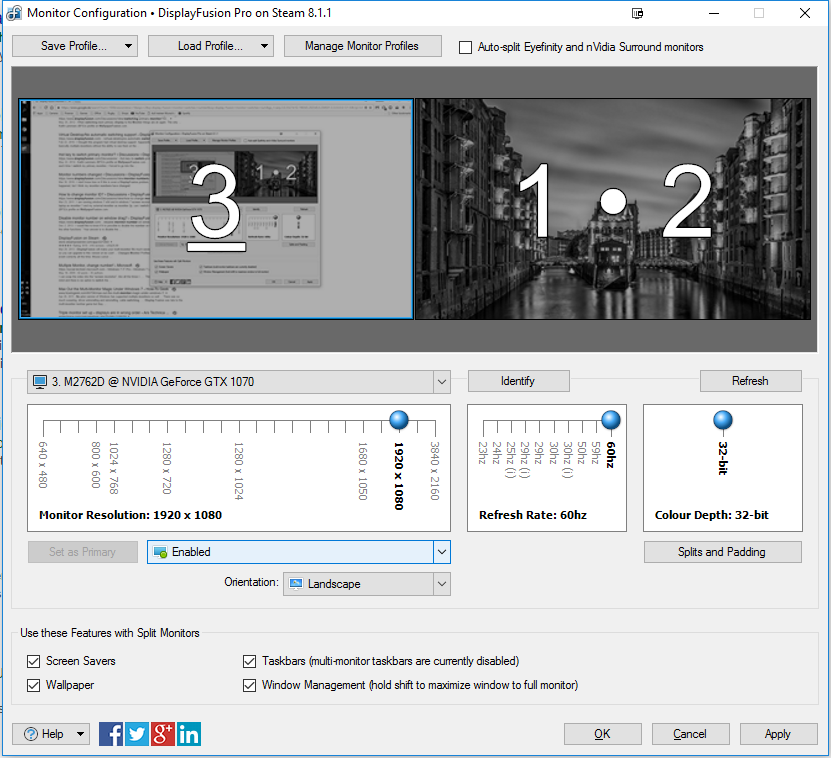 Monitors 1 & 2 are enabled, 3 is disabled.