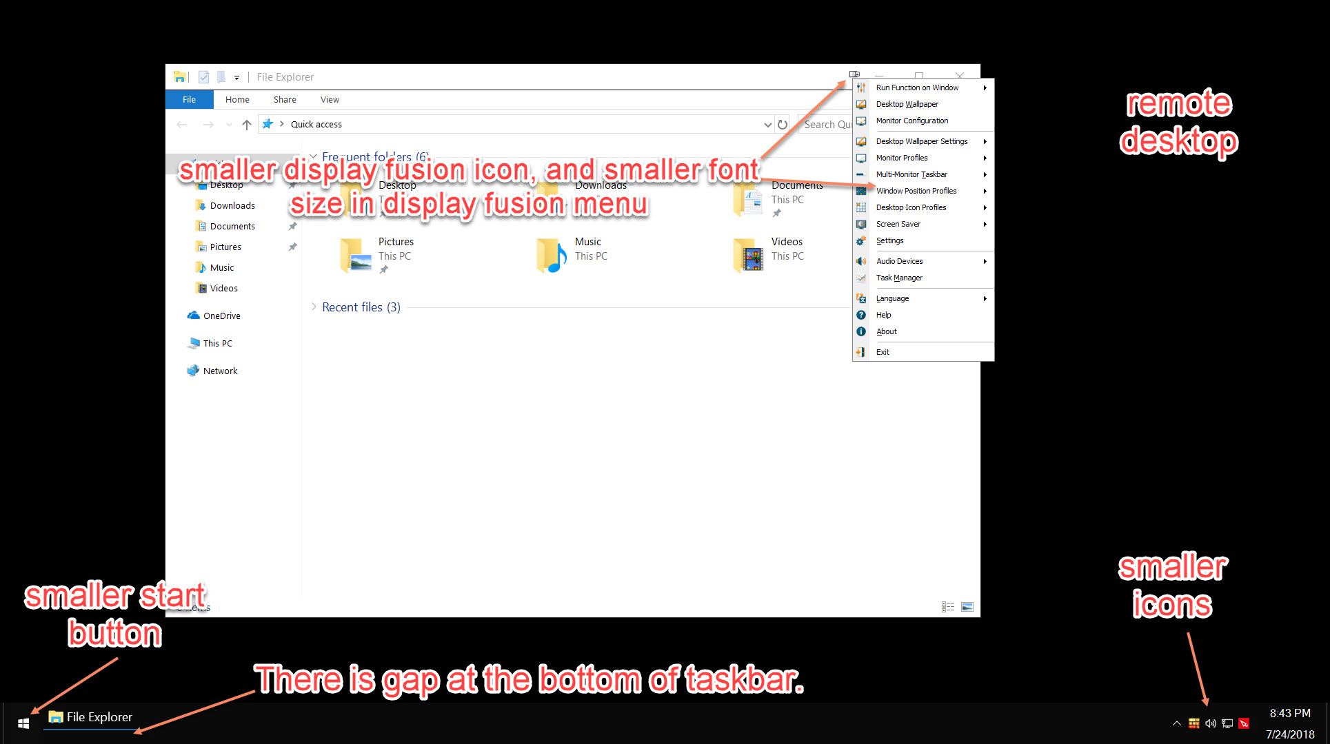 When I directly login to the remote computer, the display fusion icons and taskbar work well.