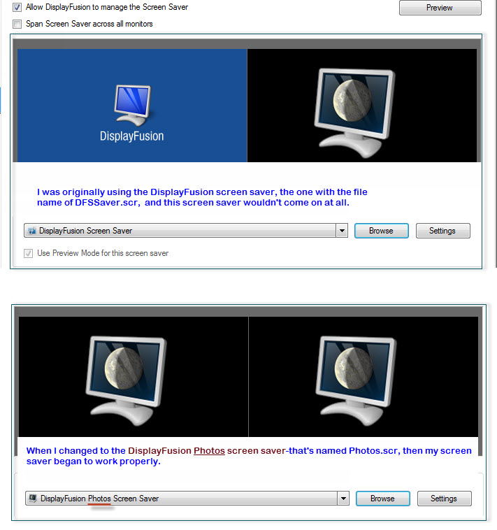 But the DisplayFusion screen saver won't work. It looks like the monitors will 'blink' -when it's time for the DisplayFusion screen saver to become active, but after the blink, the DisplayFusion screen saver doesn't begin, and of course, only the desktop is shown.
