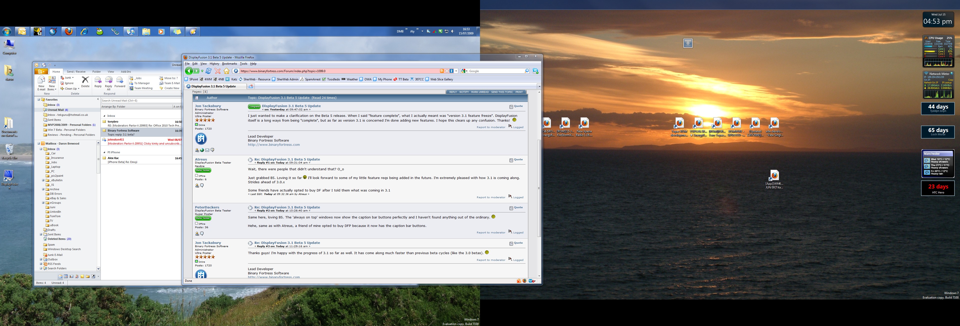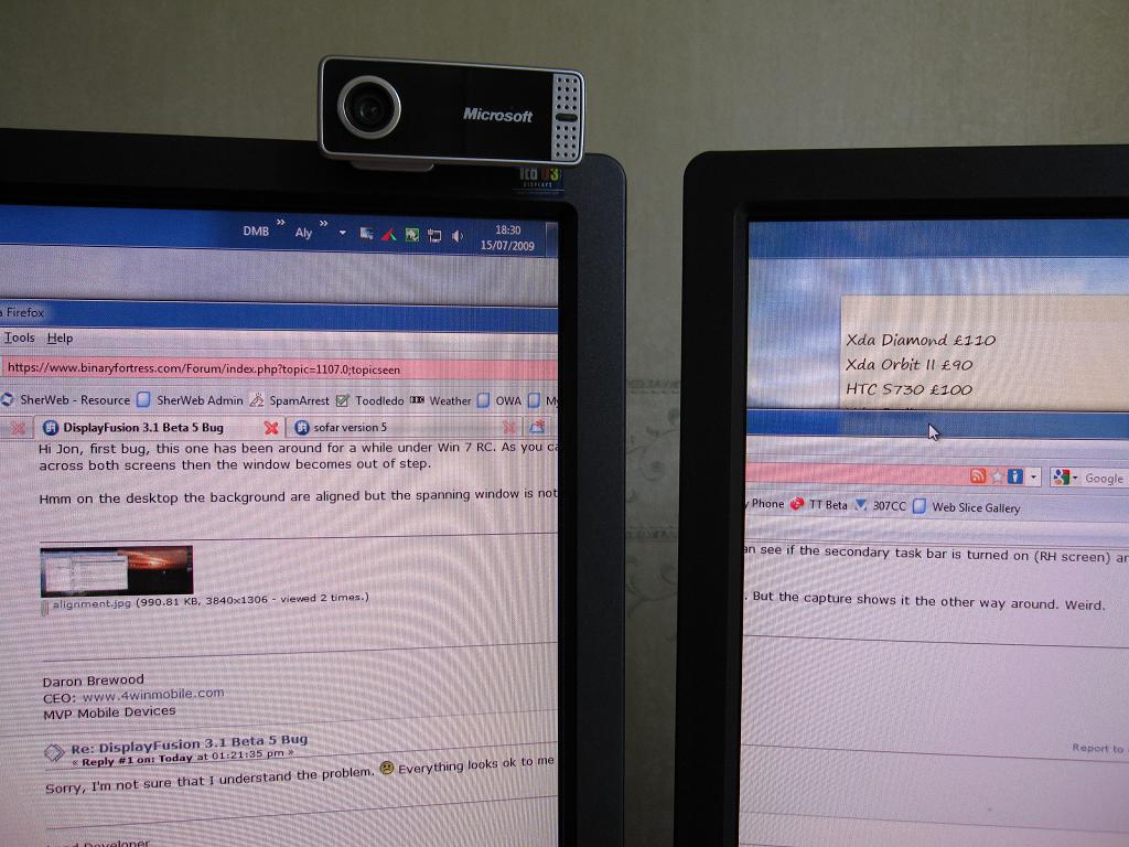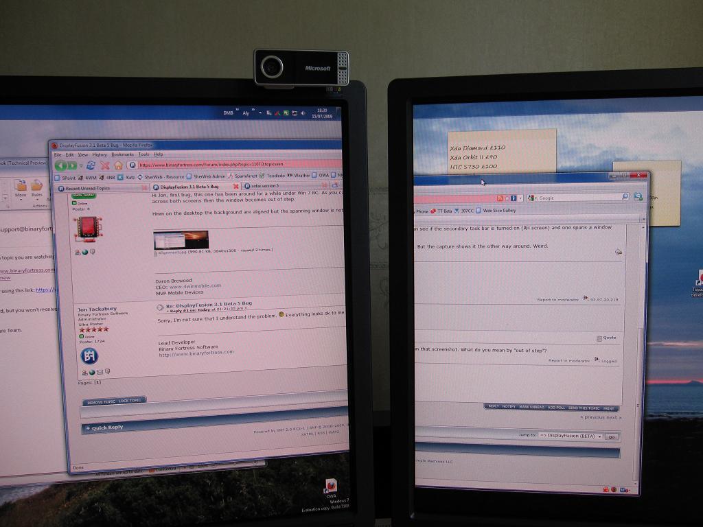 Hi Jon, first bug, this one has been around for a while under Win 7 RC. As you can see if the secondary task bar is turned on (RH screen) and one spans a window across both screens then the window becomes out of step.