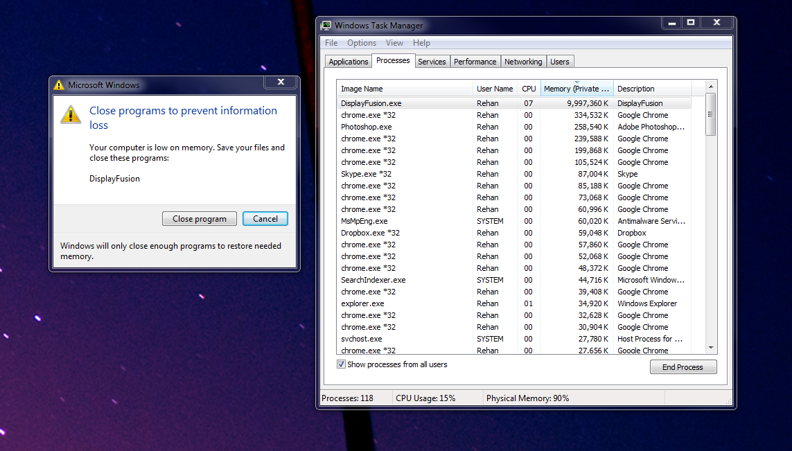 @Rehan: Can you try deleting this folder on your computer: "D:\Pictures\DisplayFusion\Web Images"? It looks like DisplayFusion has cached a bunch of files that it doesn't need anymore, and for some reason it's having an issue deleting them. After this it should work fine. Thanks!