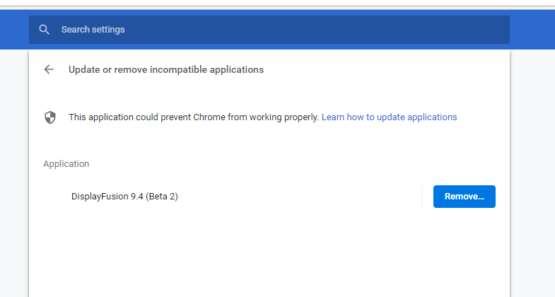 You can safely ignore this message in Chrome. In the latest version of Chrome, they've started listing out any applications that use application/global hooks, regardless of whether they're actually causing a problem or not. DisplayFusion uses hooks for features like the Multi-Monitor Taskbars and TitleBar Buttons, but it shouldn't be causing any actual issues with Chrome or other applications.