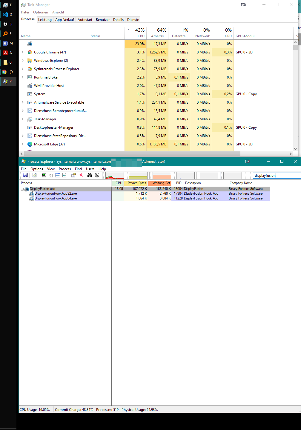 Chalk me up for unacceptably high CPU usage too, and more page faults than any other process on my computer. Win 10 Pro 1909. I too use DF only for multi-monitor features. I am currently trying the 9.7.1 Beta, but that didn't seem to help the perf from 9.7.