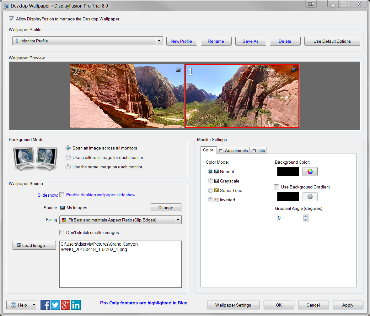 At work I have 2 side-by-side monitors and DF is great for taking 1 image to span across both. However just recently, [sometimes, but regularly] when I undock->dock my computer (Dell E5570)the loaded background image disappears and goes to a black background. I attached both screenshots of what it normally looks like and then when the un/docking happens.