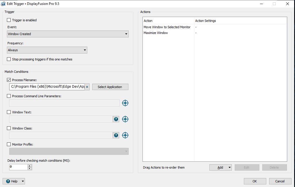It's likely that Edge is creating those tooltips as regular windows, so DisplayFusion Triggers catch them. If you set the Window Class in the Trigger rule to "Chrome_WidgetWin_1", that should hopefully resolve the issue.