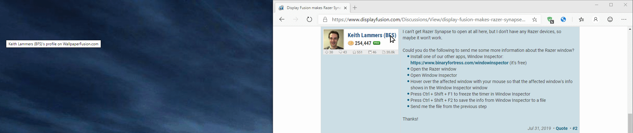 I noticed an issue with the new Edge browser based on the Chromium engine. I have a wide screen monitor split into 3 sections. if I have the browser in position 2 or 3, any dialog such as the Save Dialog or a popup get moved to the first split. Please note the screen shot when I hold the mouse over Keith Lammers name, the popup appears in the correct location and then quickly moves the left.