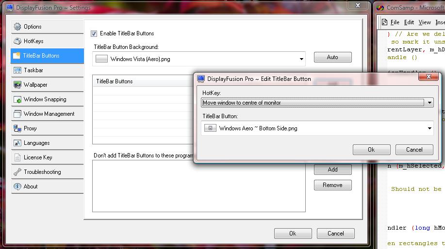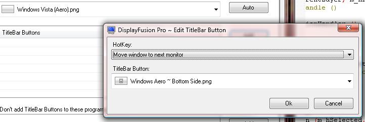 It would be much nicer IMHO if the TitleBar Button dropdown changed automatically to the "Windows Aero Next Monitor.png" as shown in 4button.jpg, eliminating my third step. This selection could be made based on the TitleBar Button Background selection on the TitleBar Buttons tab of the Settings dialog (see 2button.jpg). If you find this behavior too friendly, that is changing the second dropdown when changing the first (esp. in the case of people who choose the button then the behavior), I would consider adding a checkbox that states "Don't automaticaly choose TitleBar Button".