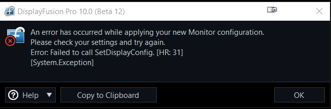3. But here's something else. As soon as I turned off my 127v power strip - cutting off the power supply to both the PC and all screens - when I turned it on again the SetDisplayConfig. [HR: 87] error would pop back in. I re-did this a couple of times, and while only turning off/resetting Windows won't affect DisplayFusion, I can confirm cutting off the power always results in DisplayFusion failing to switch profiles afterwards. If I don't cut off the power, the error won't appear. If I do, the next time I boot Windows, it'll give me the Error: Failed to call SetDisplayConfig. [HR: 87].