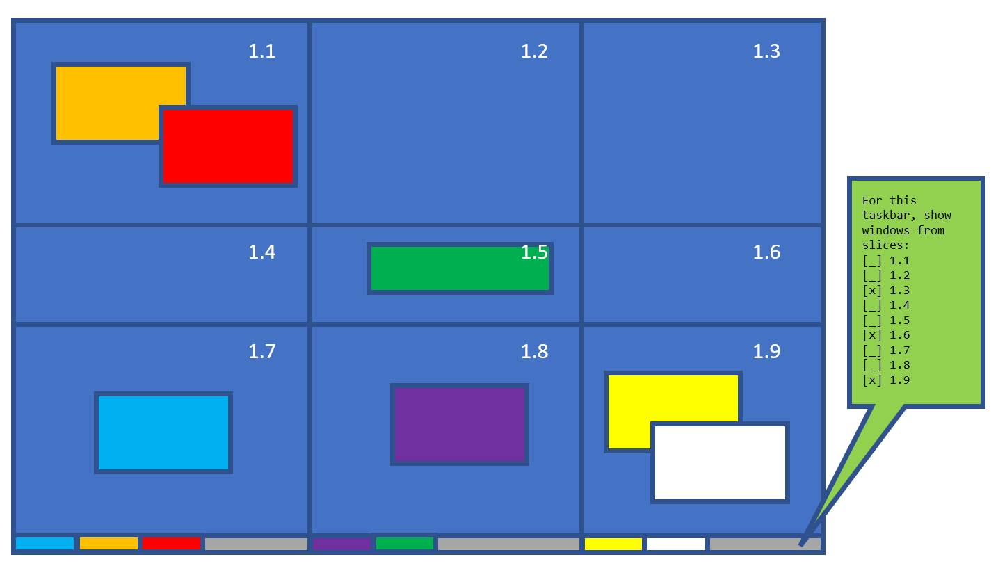 My use case is for when there are vertical stack of slices, where slices not at the bottom or top don't really have a monitor edge to place a taskbar (looks ugly with a taskbar in the middle of the screen). But what if I could configure the taskbar at the bottom of the stack to show entries for all the slices above it? Then I won't need a taskbar for each slice.