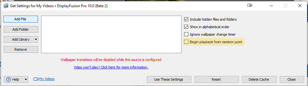 I have a request to have a setting included in the video wallpaper settings. I would very much appreciate the option to have DisplayFusion pick a random spot to start the video, whenever it changes.