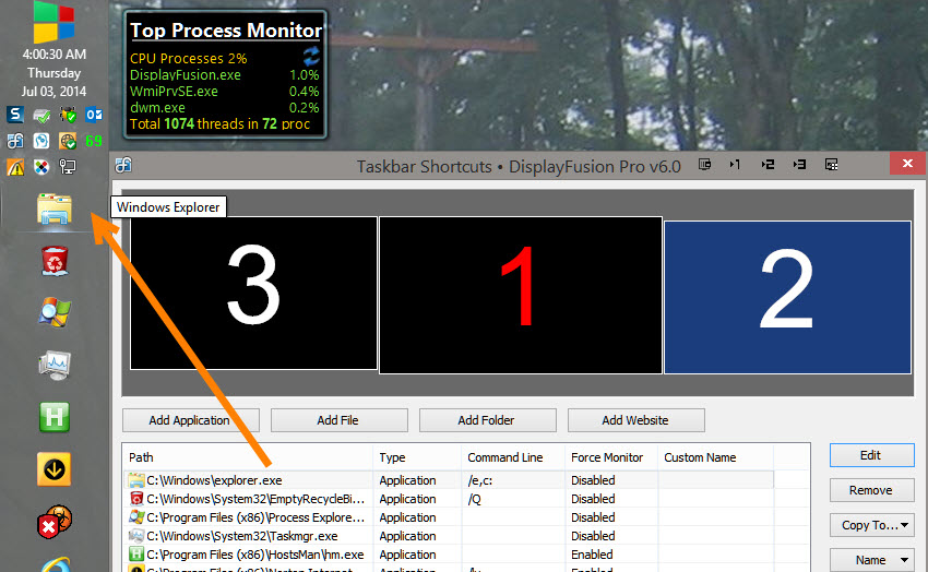 This is a minor GUI type issue. On Windows 8, if the user puts File Explorer (Windows Explorer) in the DF taskbar as a shortcut, DF displays it as "Windows Explorer". The same shortcut is labeled "File Explorer" on the primary Windows 8.1.1 taskbar. The file in question is "explorer.exe" located at C:\Windows.