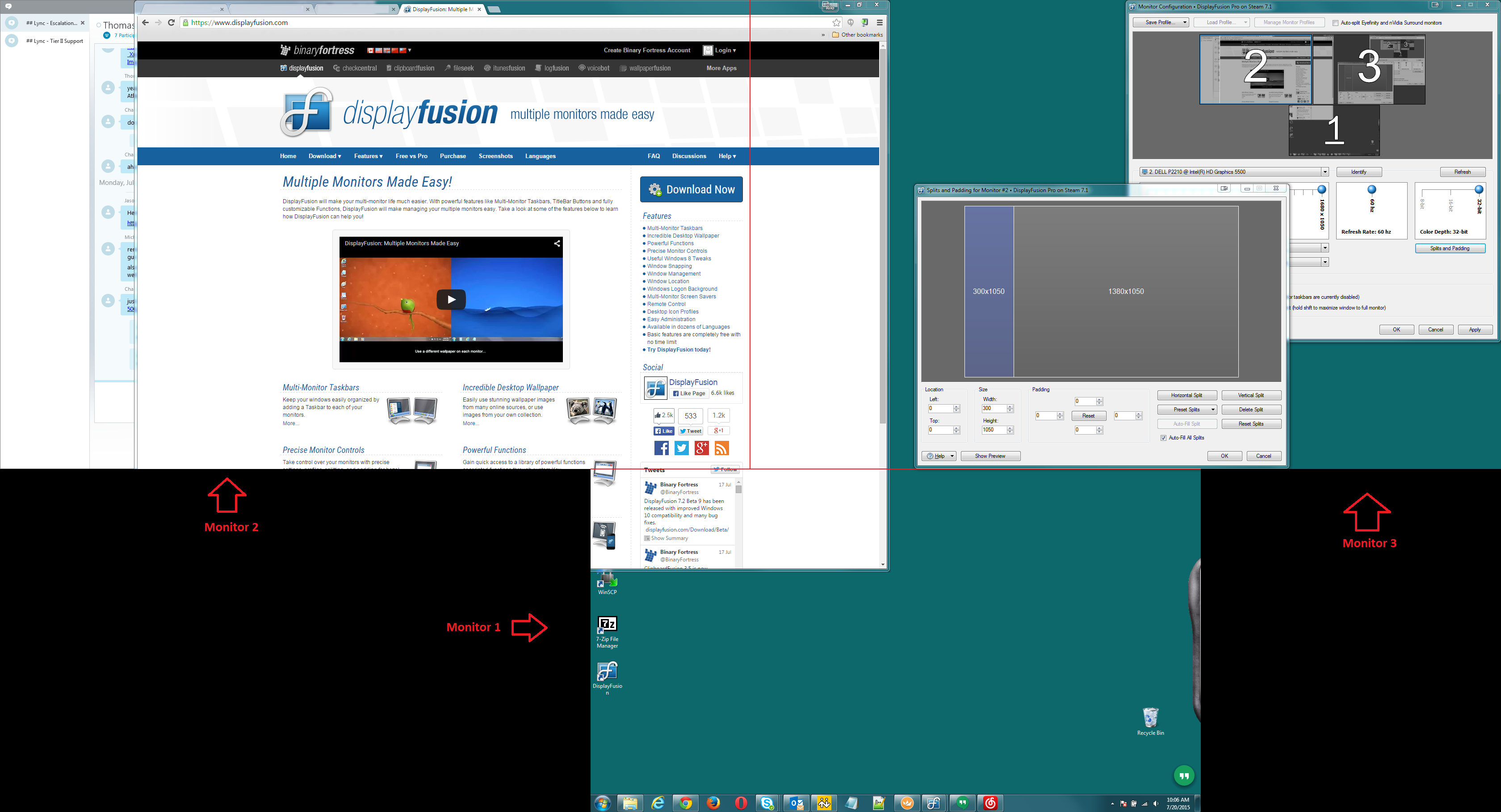 The issue I've run into is when I split "monitor 2" by 300x1050 and 1380x1050. If I full screen anything on "Monitor 2.2" (1380x1050) the window will overlap to the other monitors. (see attachment "overlap.png") The screenshot shows Chrome in full screen, I have also attempted this with Firefox and got the same results. If I full screen a program like Outlook 2013 I was not able to reproduce.
