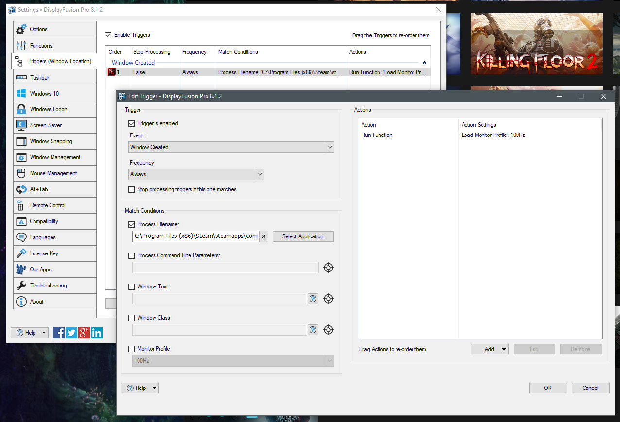 Hi, I'm trying to setup a trigger so it will load a specific monitor profile when a specific application launches. I've attached an image of what I tried, not sure why it doesn't work. I also tried specifying the window name instead of the using file location but that didn't work either.