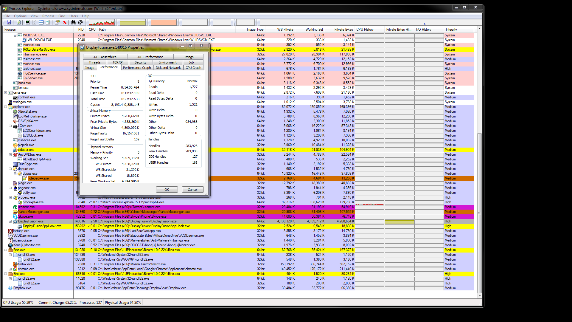Another thing is (in the 2nd screenshot) that the Peak Handles as listed by Process Explorer is way the heck up there, but has returned to 'normal' after I had logged back in. This climbed up to ~5300 in the time since I took that screenshot and have written this all up.