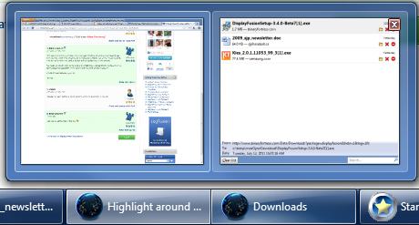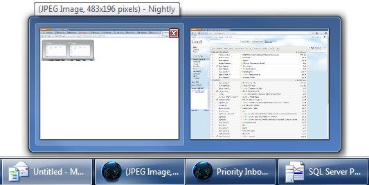 From Keith in another discussion, "We've added the highlight for the active window preview. Still working on the option to cycle through windows on left-click." This is nice, but only works when the application is active. With the actual Win 7 taskbar previews, one of the windows will always have the border around it. With the DF taskbar, the preview only has the highlight border if it is the active application in Windows.