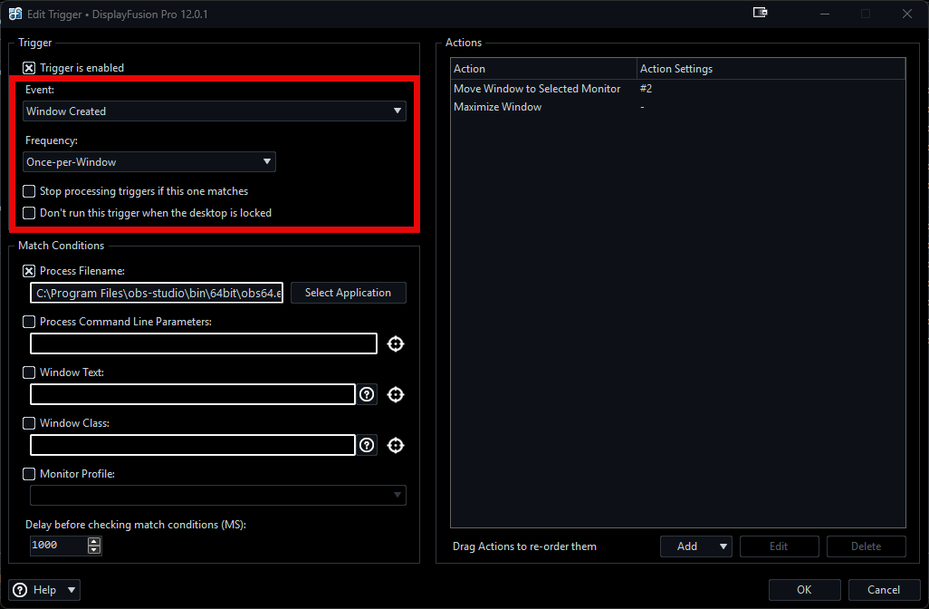 Have you tried the "Once per Window" frequency setting while using the "Window Created" trigger event? I noticed your trigger is set for "Window Focused" but usually when a new window opens, it doesn't generate a window focused event, which is likely why you were getting the double-move even on "Once per Window."