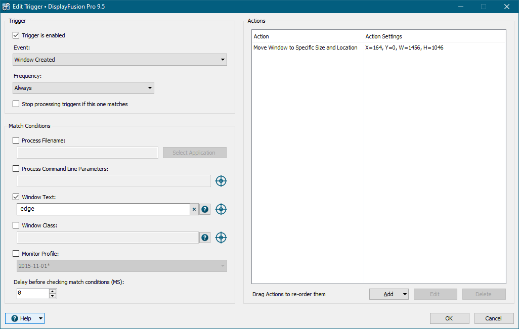 I can't figure out how to get Windows modern/metro apps, like the Microsoft Edge browser or Windows settings, to open where I want them and at the size I want. They usually open in full screen on my primary monitor. I have tried using the instructions at https://www.displayfusion.com/Discussions/View/configuring-trigger-rules-for-universal-apps/?ID=36119d2c-9928-424c-8cfb-8a60d0e60d69 and modifying them for apps other than Calendar but the trigger never works.