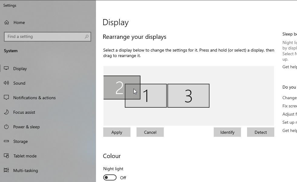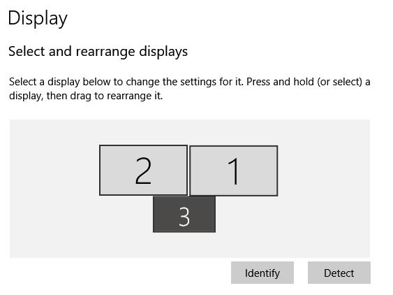 Well, that wasn't what I wanted, but it got me looking at the arrangement again and I tried the simple solution which I thought I had previously tried. I probably neglected hitting the Apply button before (old age problem). So, here's what I now have, and it works. I can move the cursor from any of the three monitors to any other with a logical move across physically adjacent borders.