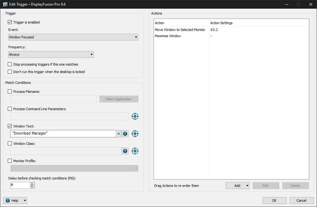 I had to use the "Window Focused" event for some programs. The trigger actions are executed every time the window is focused, that's ok but I wonder why if the condition is matched why it has to re-execute again? it creates this shifting behaviour (attached).