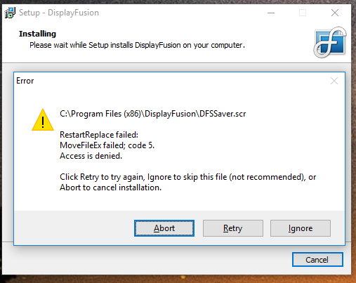 This usually happens if antivirus software is blocking the DFSSaver.scr file (it's the screen saver that runs when you allow DisplayFusion to manage the screen savers. If you're able to temporarily disable your antivirus during installation, that should resolve this error