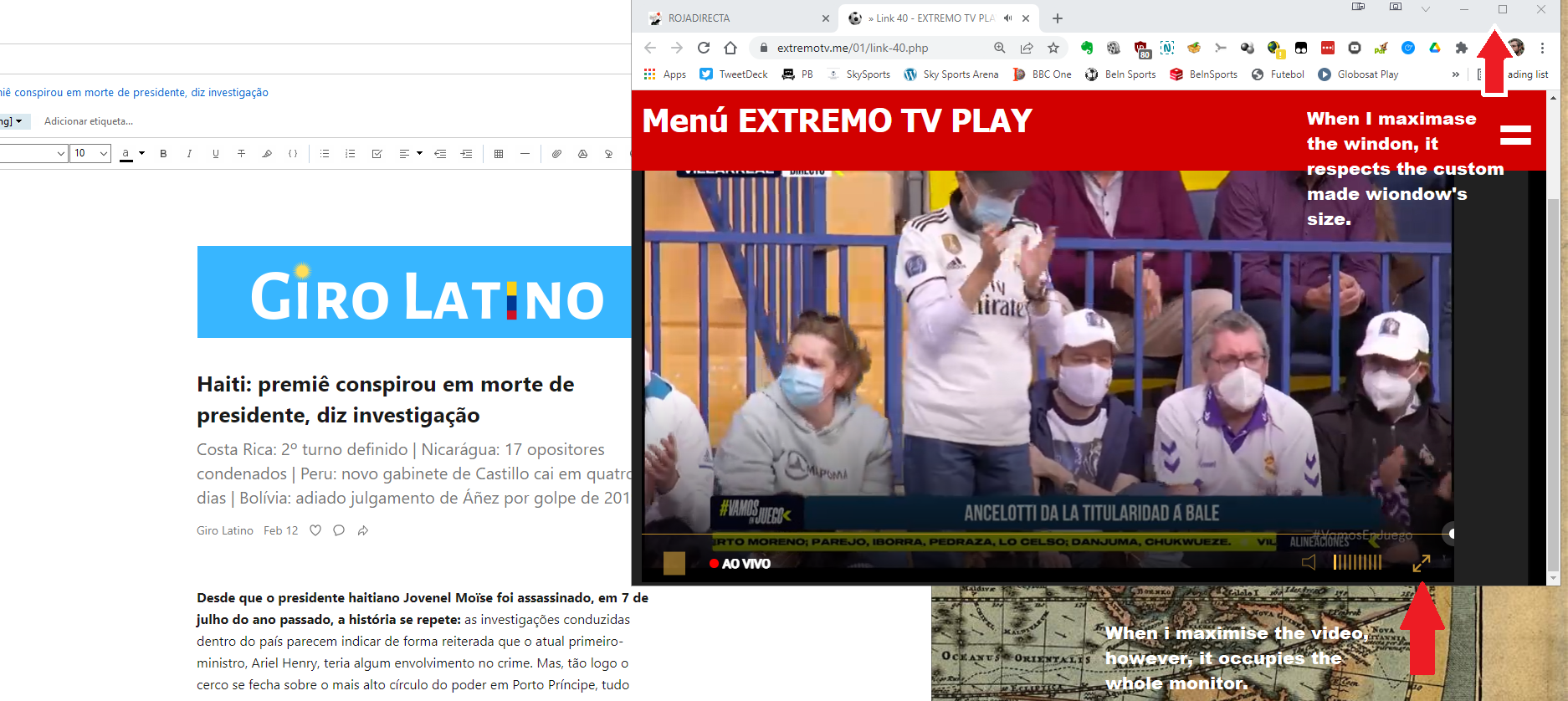I've been having an issue that's a bit weird. I'm watching a video inside Chrome in one of my custom made window (that's smaller than the whole monitor). If I maximaze chrome, no problem, it respects the boundaries of the custom made window, however if I maximaze (full screen) the video (like a Youtube video) and not the browser, it stops respecting the boundaries of the custom made window and occupies the whole monitor. In other words, I can maximize an app, but wathing anything full screen it stops respecting the boundaries I created.