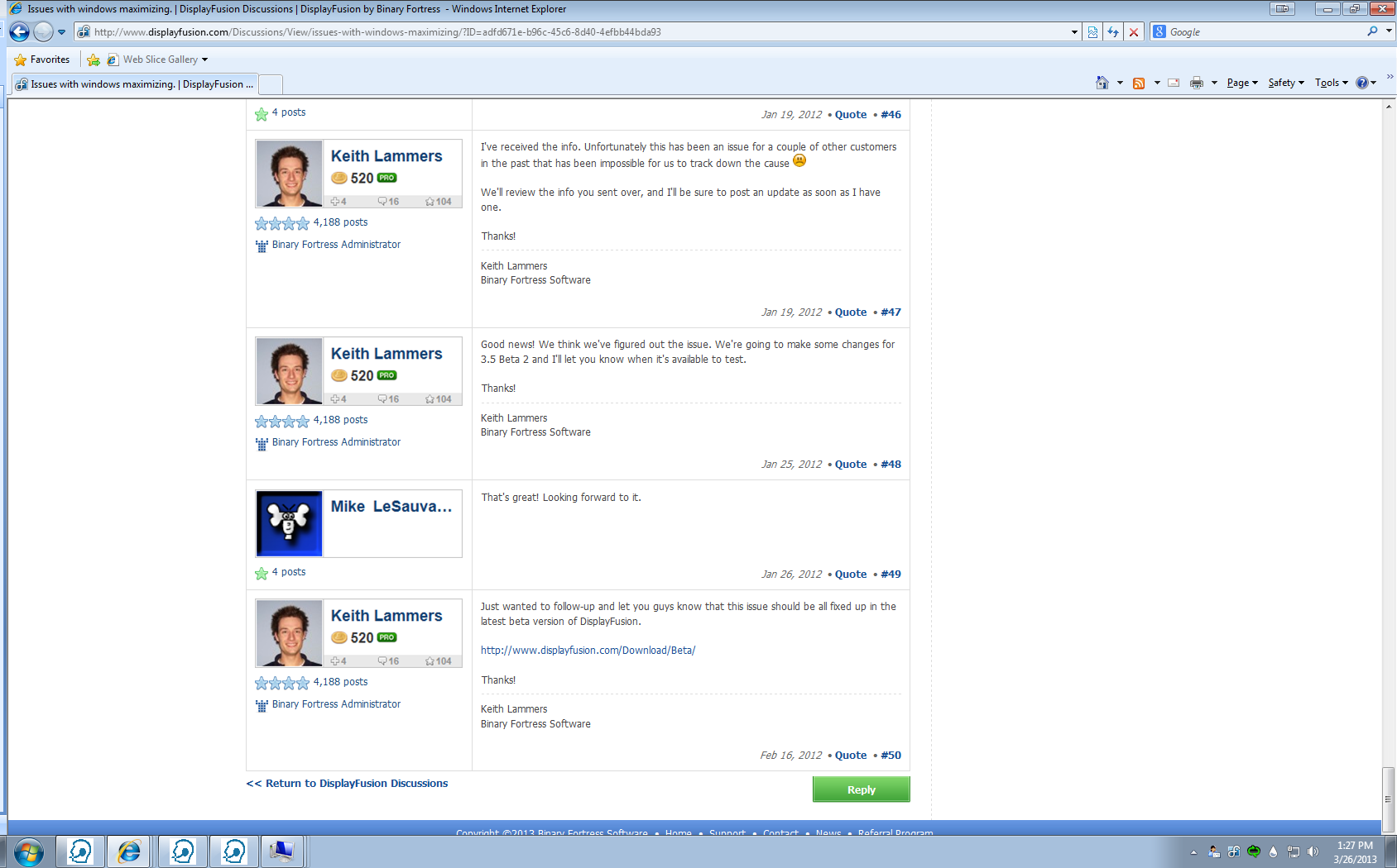 I am currently using the trial version of DF Pro (I hope to purchase it soon if I can figure out this issue), and I am having an issue where the windows on my second monitor will maximize to the full resolution of the screen. The problem is that the taskbar stays on top of the window, and I cannot get the window (other than resizing it manually) to only maximize to the top of the taskbar. When the window is maximized fully, if I am on a webpage with a right hand scroll bar, I cannot get to the bottom of the scroll bar. The only way to get around this is if I close out of DF Pro, and then re-open it again. Which gets frustrating, as this happens multiple times a day. I am using Windows 7 Pro, 64 bit. And the tower is a Dell Precision 490. The graphics card I am using is NVIDIA Quadro NVS 285. I have attached a screen shot of what I am talking about. As you can see the window is fully maximized behind the taskbar.