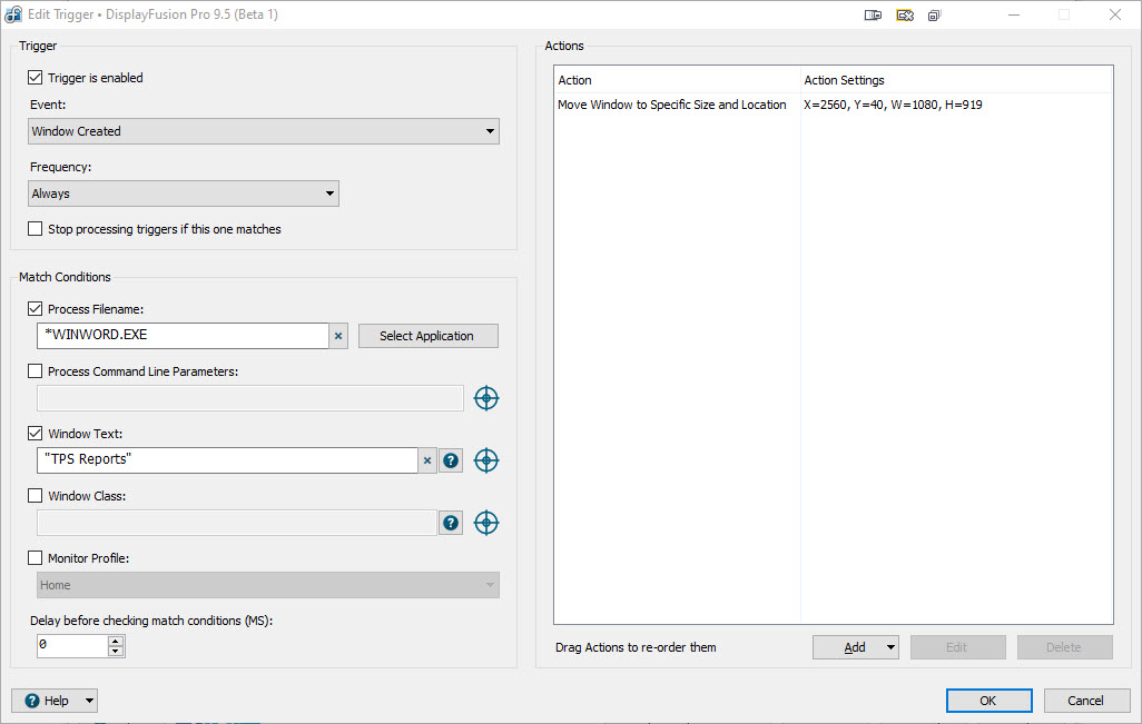 At any rate, this is how that option on the Window Management tab works. First window of the process only. To do what you want to do, the Trigger rule with the Frequency set to "Always" is the way to go.