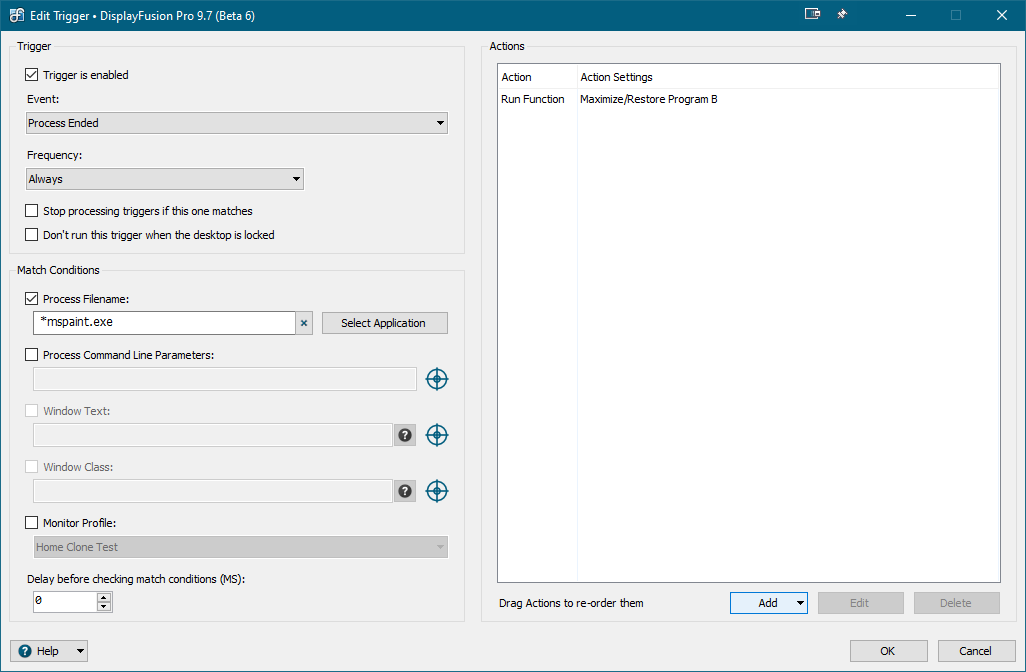 Ok, here's an example that either restores or maximizes Notepad when Paint closes. The scripted function will maximize Notepad if it's currently restored, and will restore it if it's currently maximized. The Trigger rule calls the scripted function when it sees that mspaint.exe has terminated.